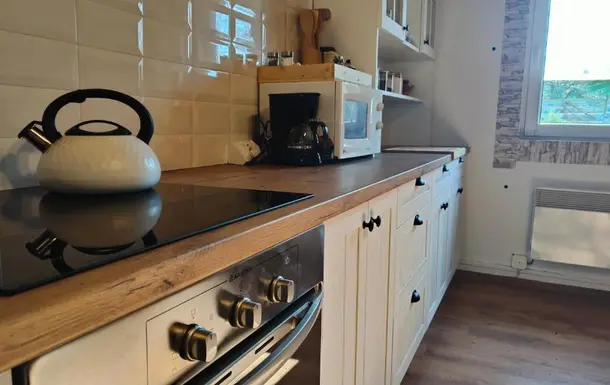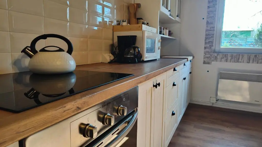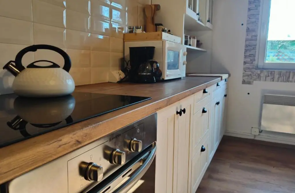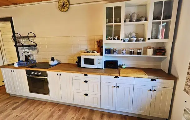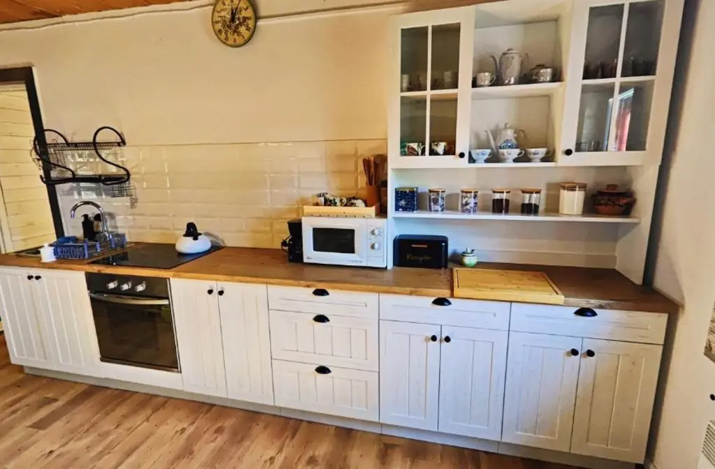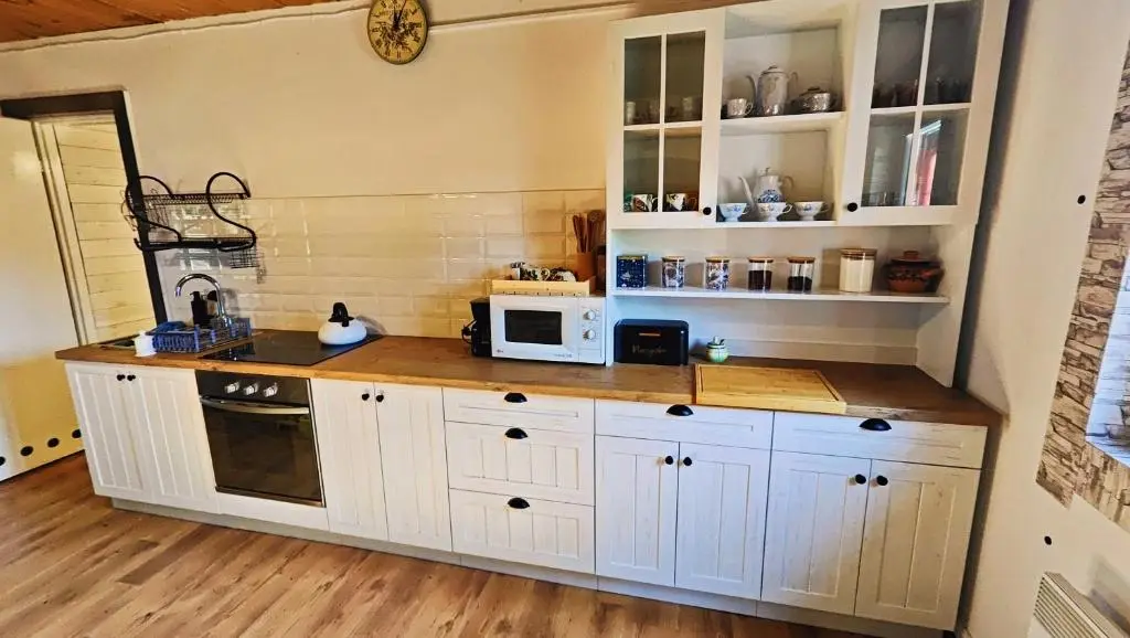 Nie samym patrzeniem w ogień człowiek jednak żyje, dlatego zaraz obok salonu znajduje się kuchnia wyposażona tak by niczego wam nie zabrakło, zaczynając od podstaw takich jak lodówka z zamrażalnikiem, kuchenka mikrofalowa, kuchnia gazowa, zlew, zestaw naczyń i sztućców, a kończąc na piecu opalanym drewnem.