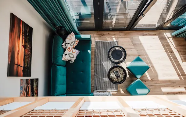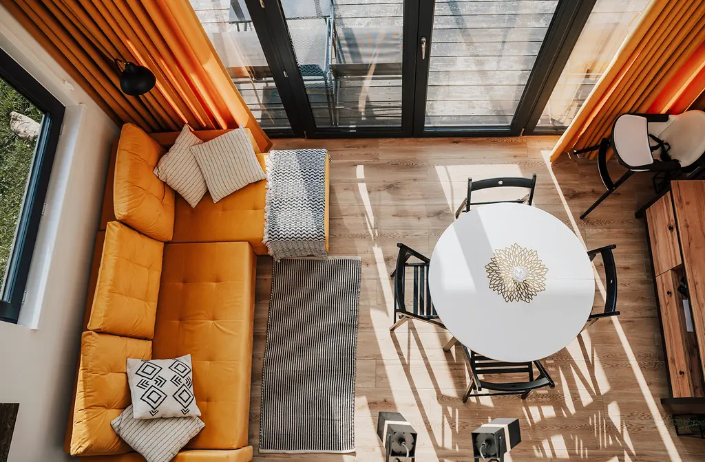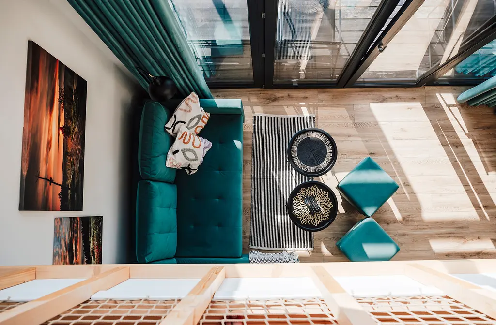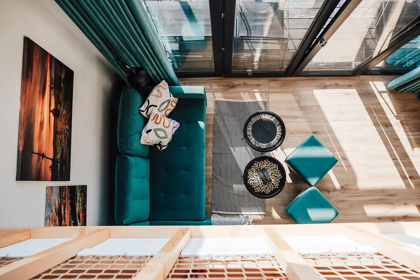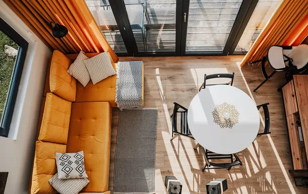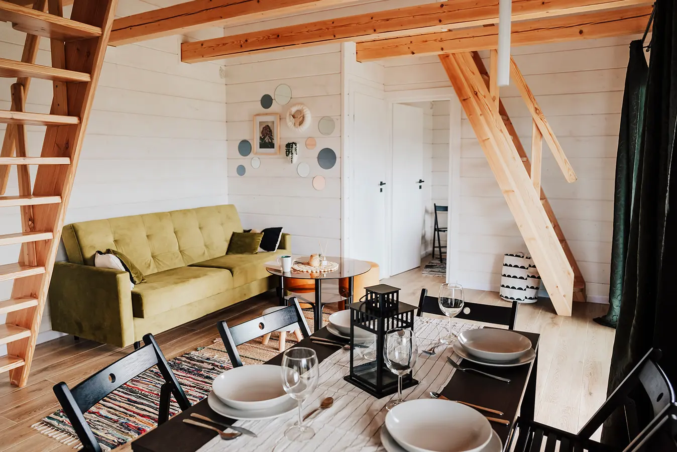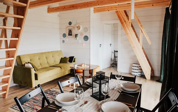 - duży salon połączony z jadalnią (rozkładany 8 osobowy stół, sofa rozkładana dwuosobowa, TV, wyjście na taras, wyjścia na antresole)
