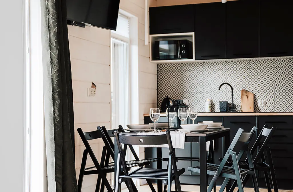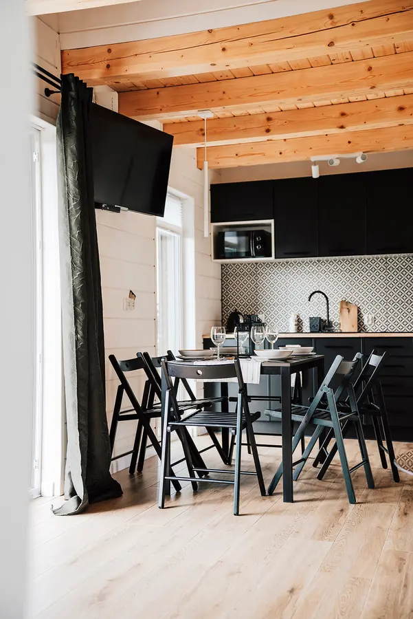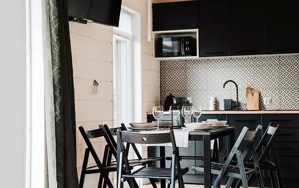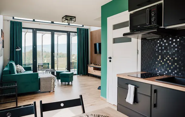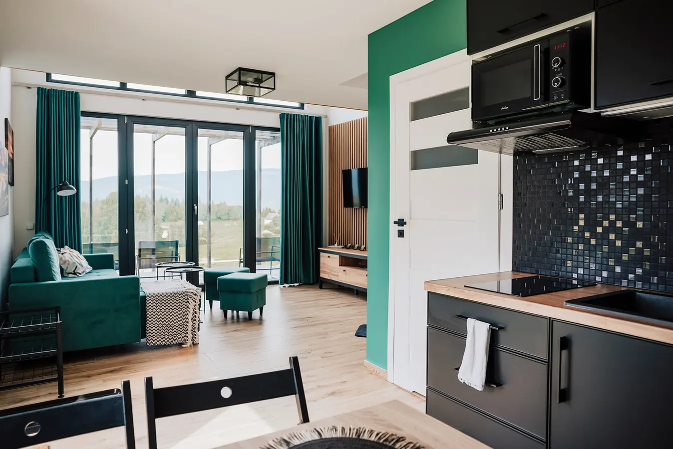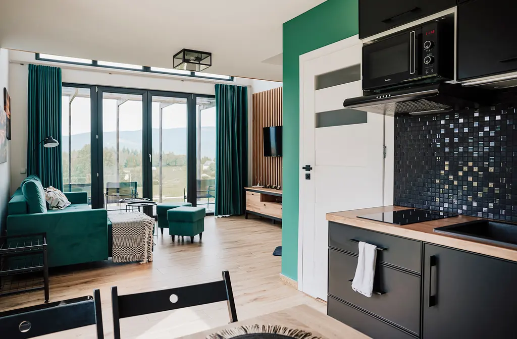 - kuchnia z wyposażeniem, min. (lodówka, kuchenka indukcyjna dwupalnikowa z okapem, mikrofala)