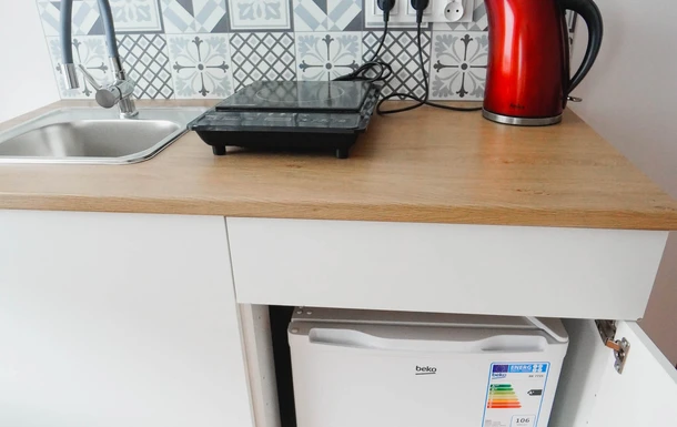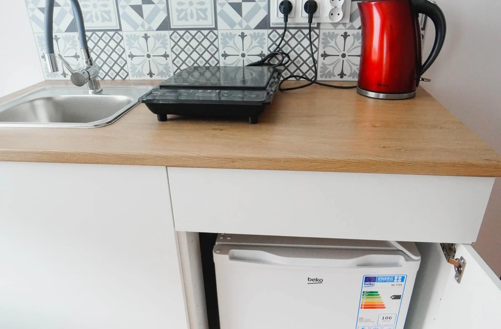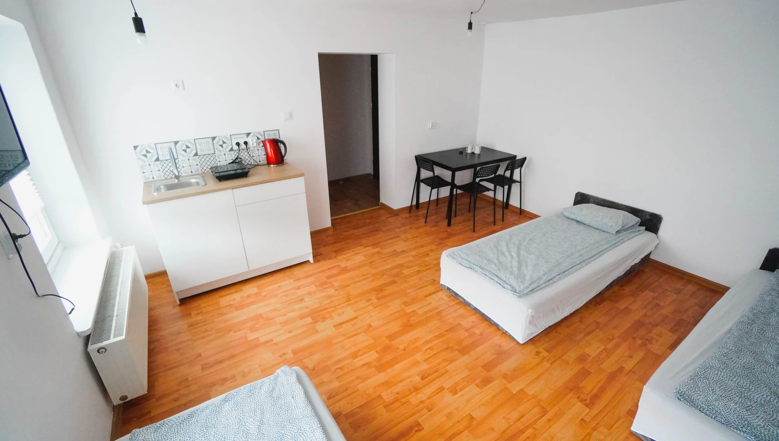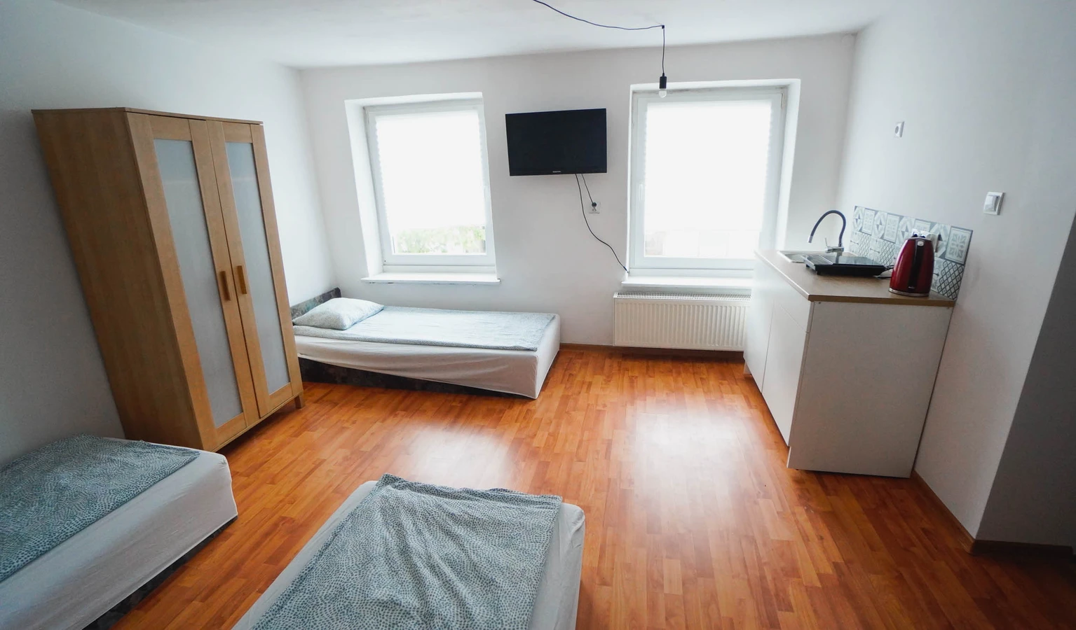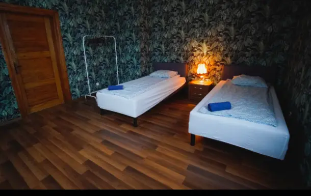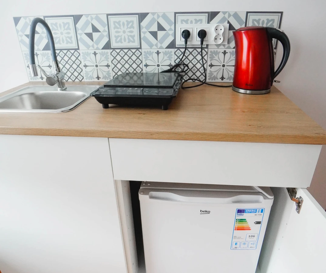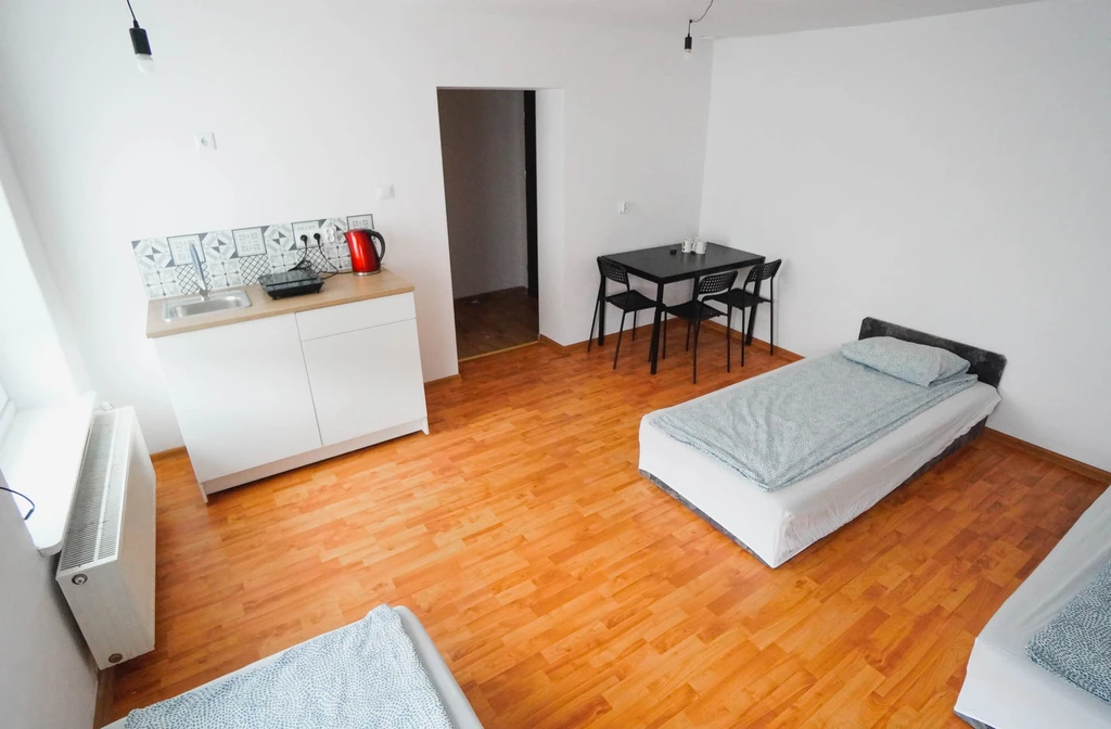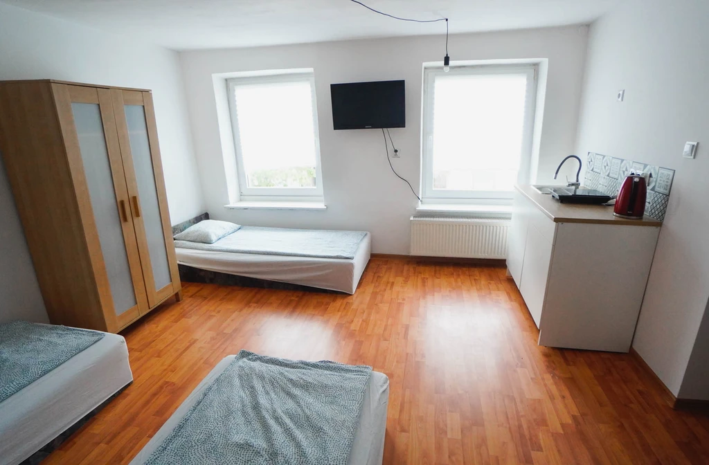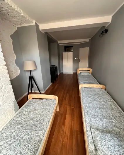 Pokój z łazienką i prywatnym aneksem kuchennym jest kolejny z kolei pokojem o wysokim standardzie w naszej ofercie. Spokoju znajdują się trzy łóżka pojedyncze aneks kuchenny z małą lodówka hotelową , płytą indukcyjną do gotowania czajnikiem oraz przyborami kuchennymi. W łazience znajdziesz prysznic z odpływem liniowym toaletę oraz suszarkę do włosów.