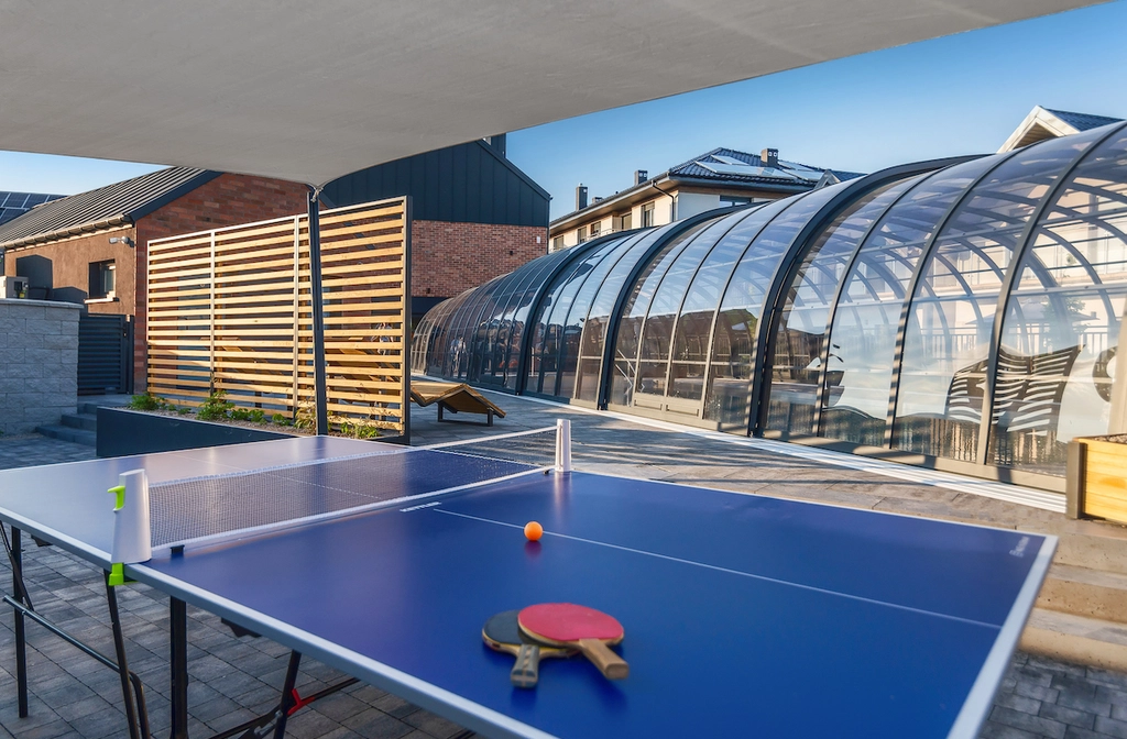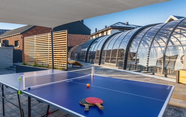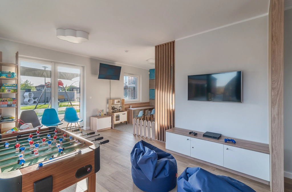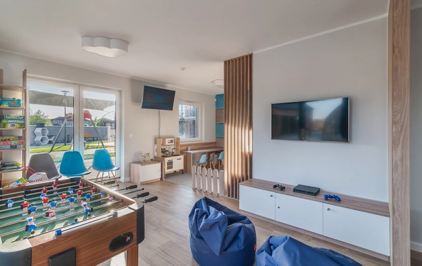 Dla naszych gości przygotowaliśmy kryty basen z podgrzewaną wodą, jacuzzi i brodzik, dwa place zabaw, sala zabaw z kącikiem malucha, grami PS4 i piłkarzykami.