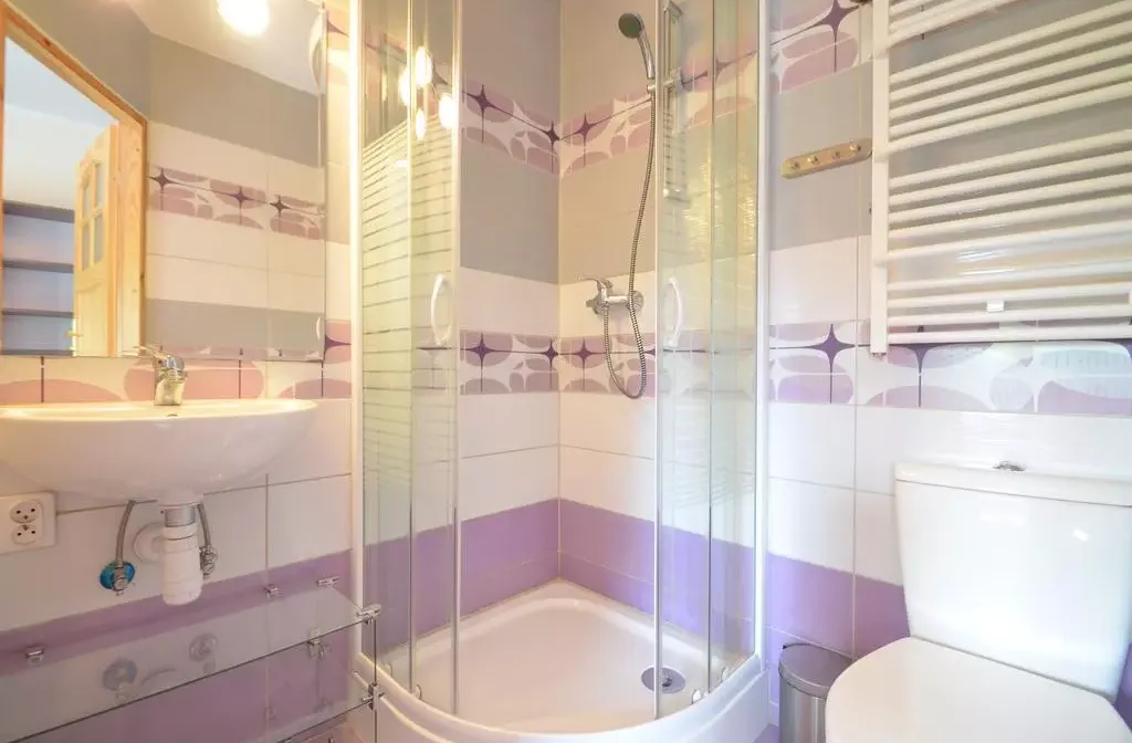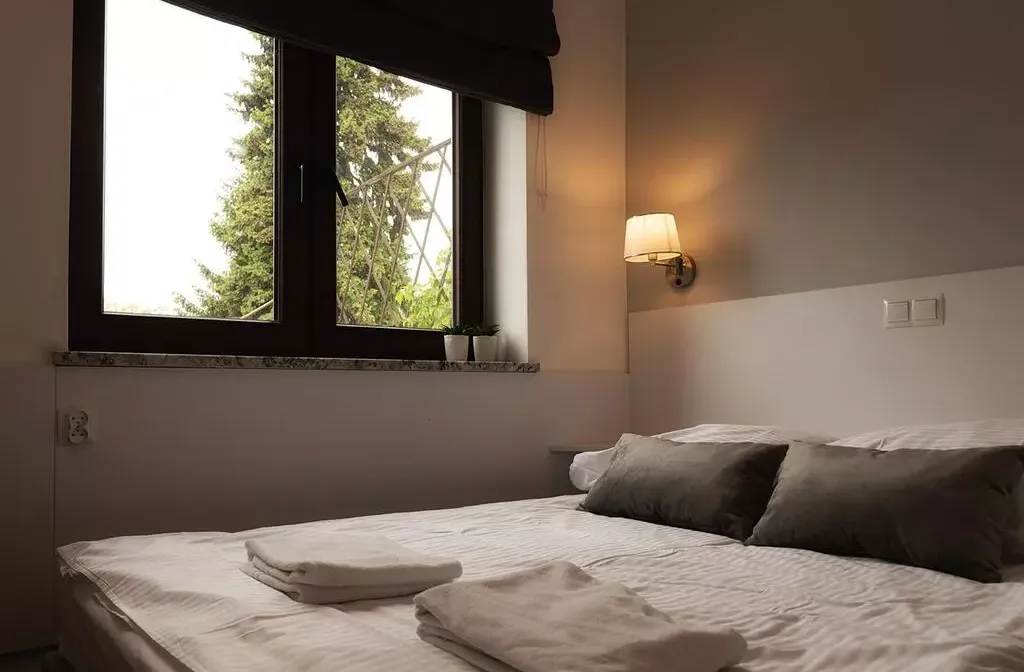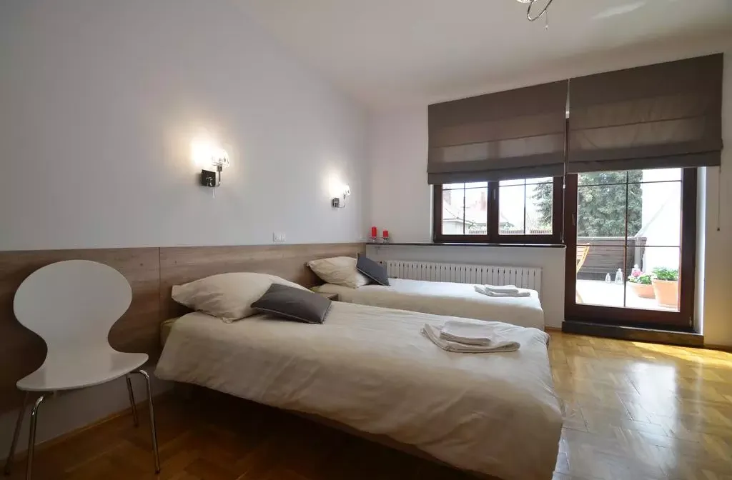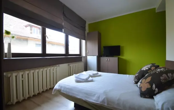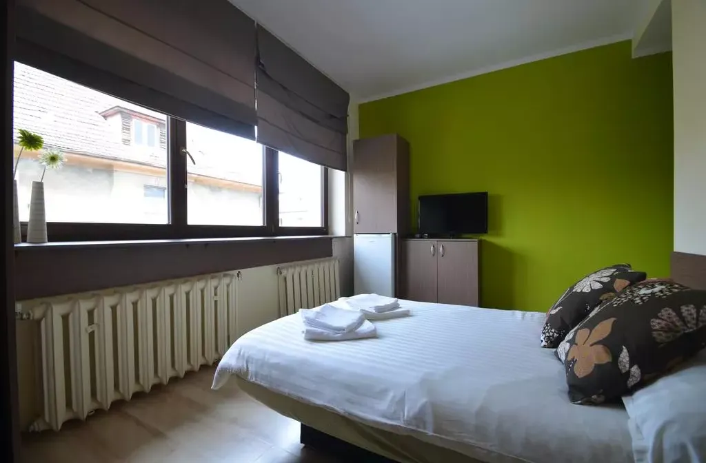 W Spokojnej pełnej zieleni dzielnicy Blisko centrum. Standard pokoju bardzo wysoki jasny, przytulny z własną łazienką . Wyposażona łazienka w suszarkę do włosów ,ręczniki, kabina prysznicowa, lustro, umywalka i toaleta.