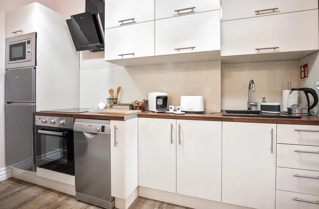 Kuchnia wyposażona w niezbędne sprzęty i naczynia kuchenne.