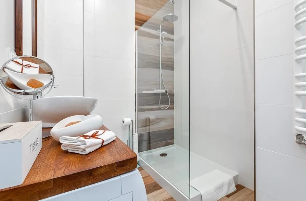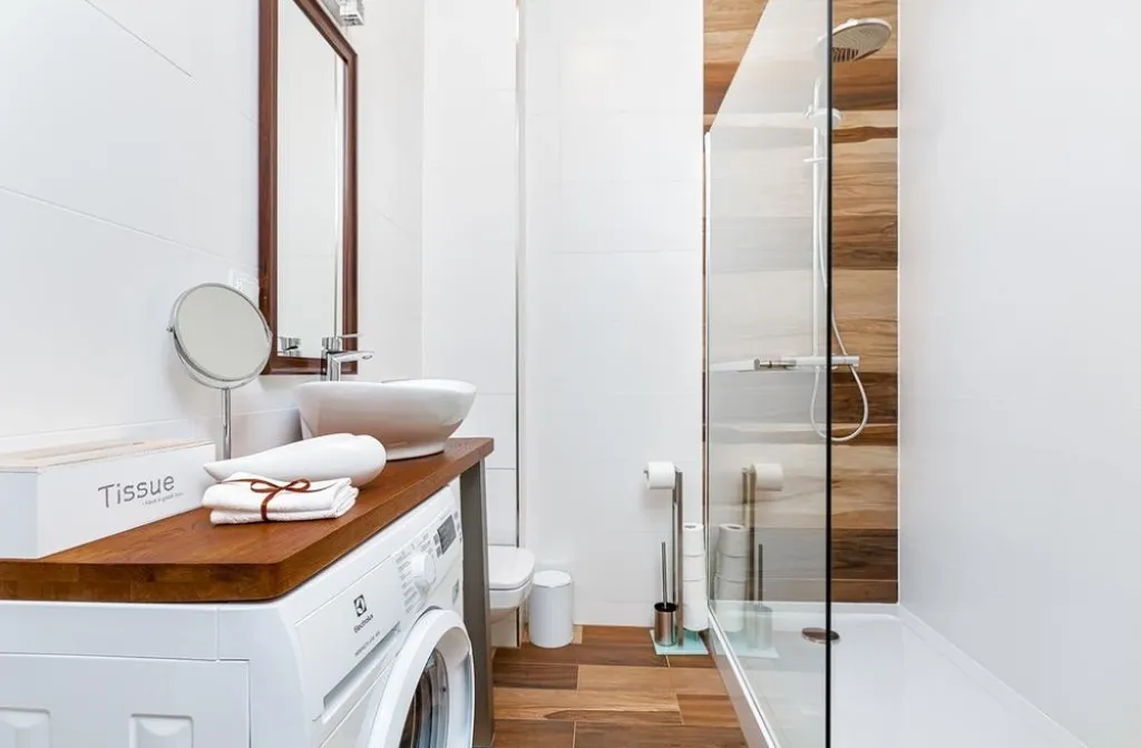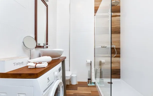 W łazience pralka, zestaw ręczników i bezpłatnych kosmetyków.