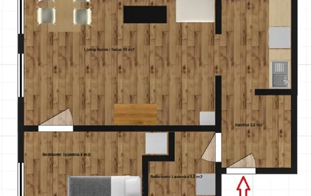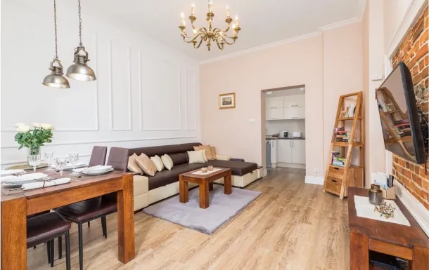W salonie połączonym z kuchnią znajduje się 49 calowy telewizor , wygodna sofa z rozkładanym pełnowymiarowym miejscem do spania dla 2 osób.