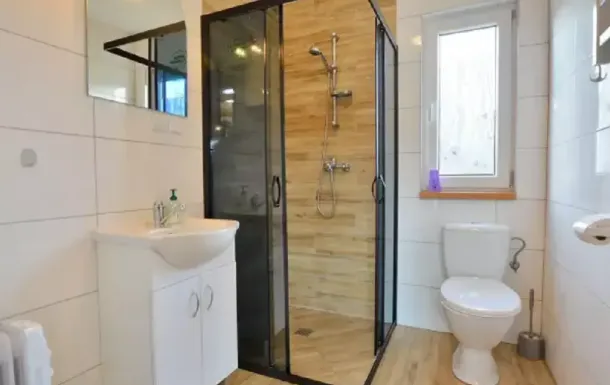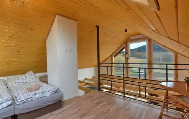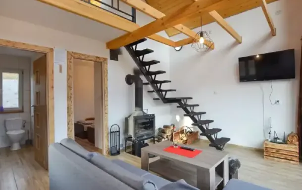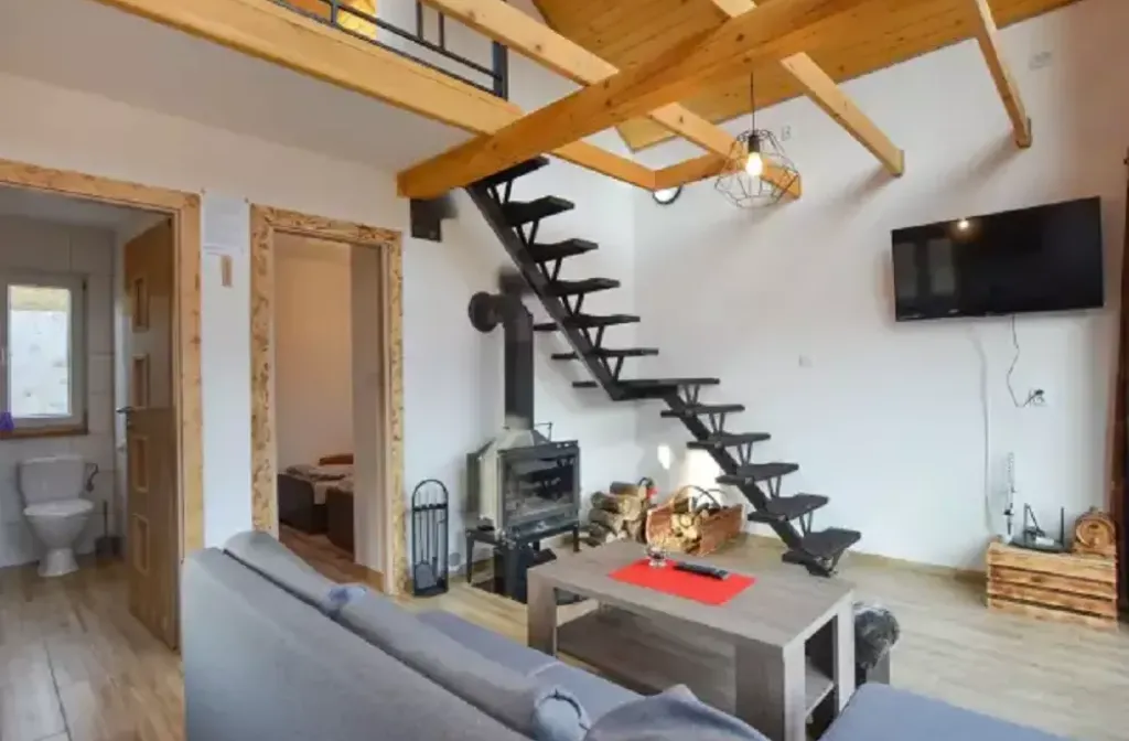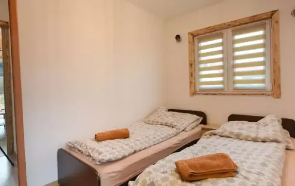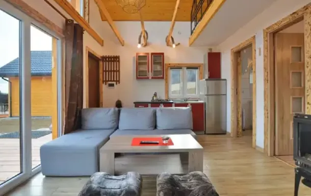 Domki posiadają salon z kominkiem, tv i aneks kuchenny wyposażony we wszystko co jest potrzebne do funkcjonowania na co dzien. W salonie znajduje się narożnik który może służyć jako miejsce do spania. Obok salonu jest sypialnia z dwoma łóżkami który w razie konieczności można złączyć i tworzy się łoże małżeńskie. Na poddaszu jest sypialnia z dwoma łóżkami a obok sofa rozkładana na której również można spać.
