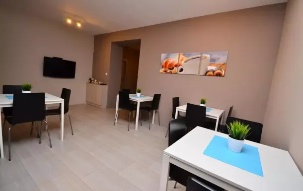-Wydzielone miejsce dla wszystkich gości ze stolikami przy których można jeść posiłki oraz pić poranną