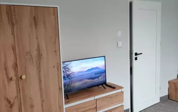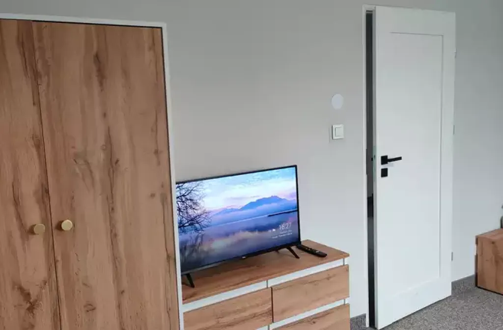 W każdym pokoju znajdują się łóżka, szafka nocna, stół, krzesła, telewizor z SMART TV, lodówka.