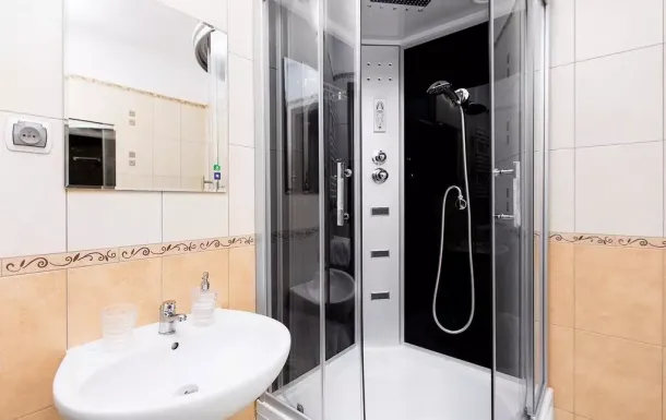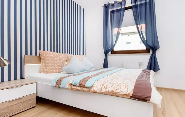 Apartament obejmuje taras z widokiem na ogród, 2 sypialnie, w pełni wyposażoną kuchnię, część wypoczynkową oraz łazienkę z prysznicem.