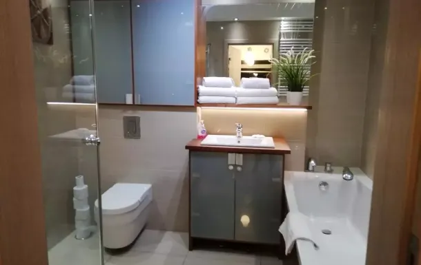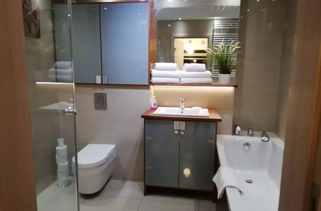 Apartament mieści 2 sypialnie, doskonale wyposażoną kuchnię ze zmywarką do naczyń i kuchenką mikrofalową, a także łazienkę z prysznicem. Wyposażenie apartamentu obejmuje pralkę oraz telewizor z płaskim ekranem i dostępem do kanałów satelitarnych.