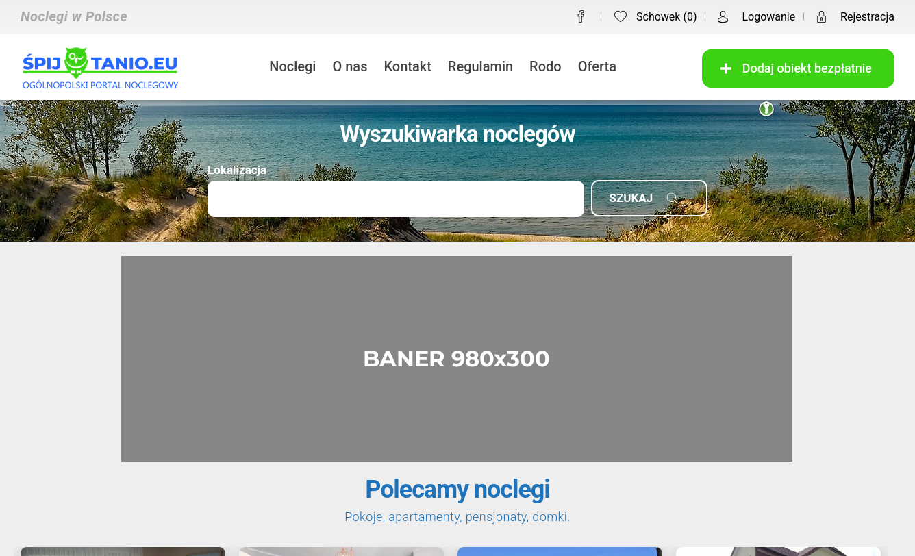 ŚpijTanio.eu to jedna z największych polskich wyszukiwarek noclegów z imponującą bazą ponad 7500 obiektów z niemal 3000 miejscowości. Nasz serwis to nie tylko funkcjonalne narzędzie dla turystów, ale przede wszystkim realna szansa na zwiększenie widoczności i rezerwacji dla właścicieli obiektów noclegowych. Nie prowadzimy systemu rezerwacji, tym samym nie pobieramy z tego tytułu żadnych opłat. Skupiamy się na promowaniu ogłoszeń obiektów noclegowych w konkretnych miejscowościach.